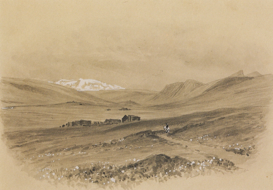 Útsýni um Laxárdal. Illustration af W.G. Collingwood, (1854-1932). Kilde: Fegurð Íslands og fornir sögustaðir