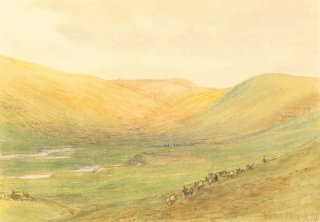Udsigt fra Saurbær i Vatnsdalur. Illustration af W.G. Collingwood, (1854-1932). Kilde: Fegurð Íslands og fornir sögustaðir