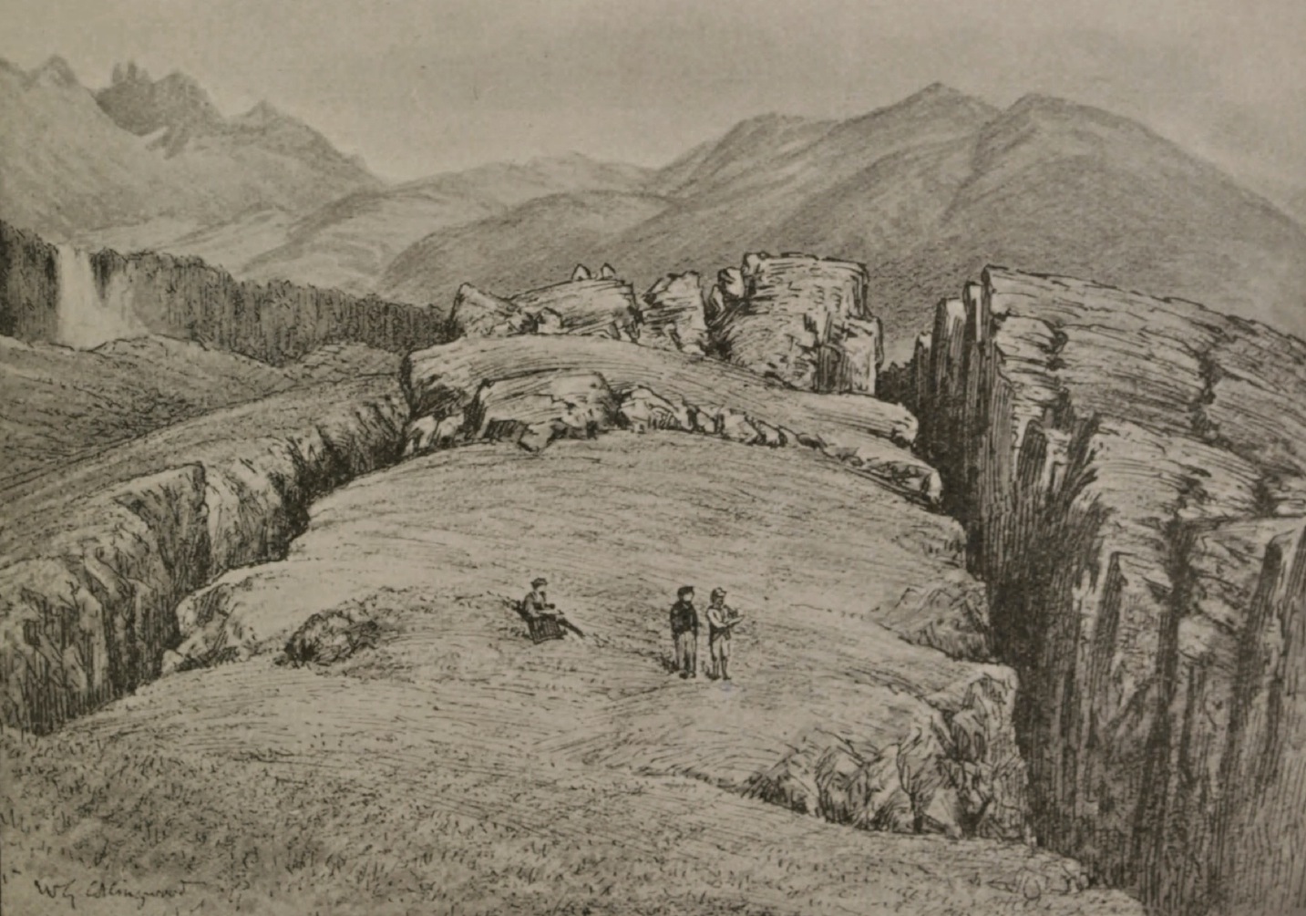 Lögberg, set nordfra. Illustration af W.G. Collingwood, (1854-1932). Kilde: A Pilgrimage to the Saga-Steads of Iceland, 1899