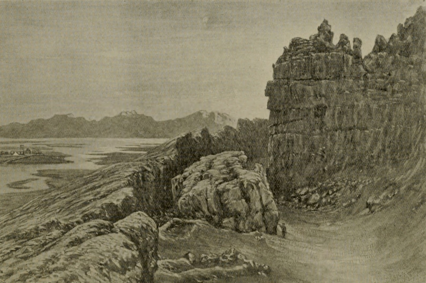 Þingbrekka og de gamle boder i Almannagjá. Illustration af W.G. Collingwood, (1854-1932). Kilde: A Pilgrimage to the Saga-Steads of Iceland, 1899