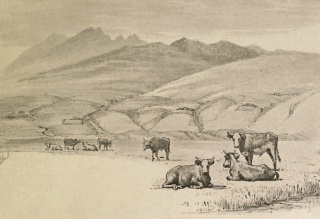 Hliðarendi. Illustration af W.G. Collingwood, (1854-1932). Kilde: A Pilgrimage to the Saga-Steads of Iceland, 1899