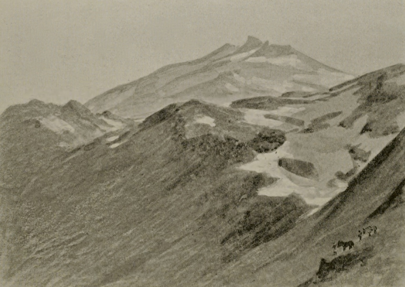 Jøklen fra Kambsskarð. Illustration af W.G. Collingwood, (1854-1932). Kilde: A Pilgrimage to the Saga-Steads of Iceland, 1899