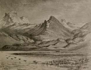 Kötluholt. Illustration af W.G. Collingwood, (1854-1932). Kilde: A Pilgrimage to the Saga-Steads of Iceland, 1899