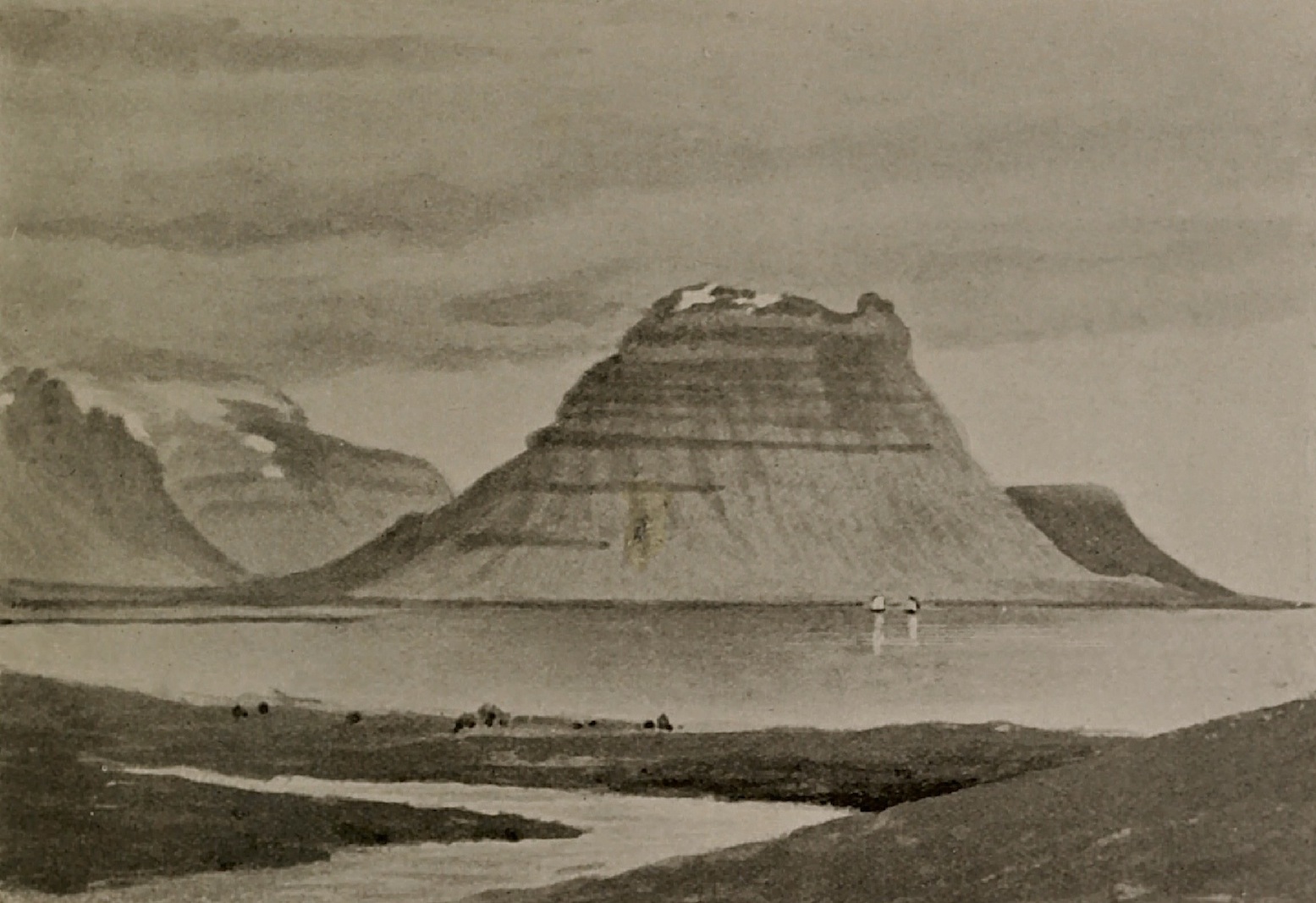 Kirkjufell. Illustration af W.G. Collingwood, (1854-1932). Kilde: A Pilgrimage to the Saga-Steads of Iceland, 1899
