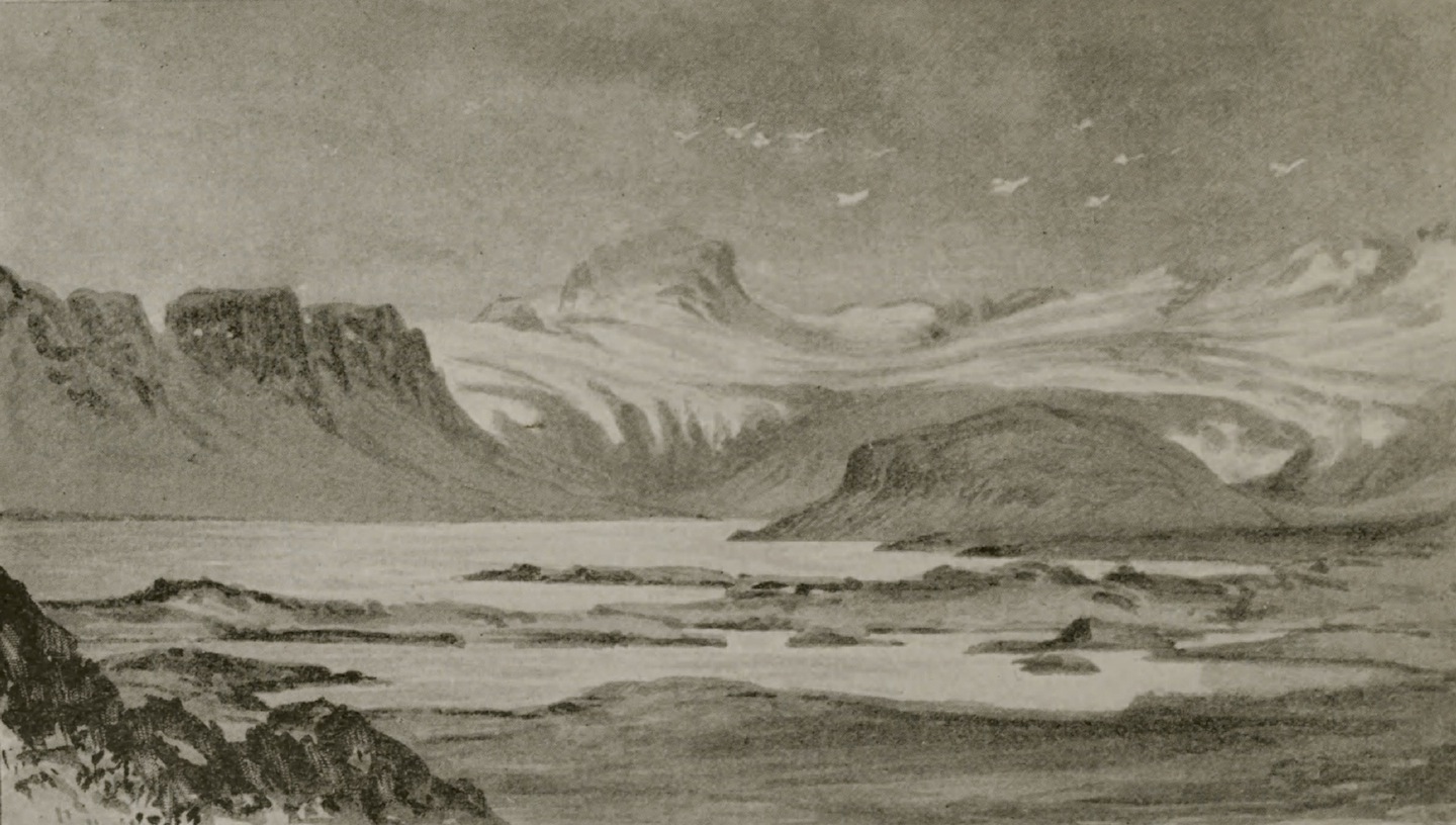 Alptafjörður. Illustration af W.G. Collingwood, (1854-1932). Kilde: A Pilgrimage to the Saga-Steads of Iceland, 1899