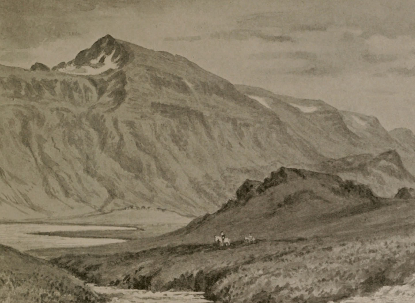 Jörundarfell. Illustration af W.G. Collingwood, (1854-1932). Kilde: A Pilgrimage to the Saga-Steads of Iceland, 1899