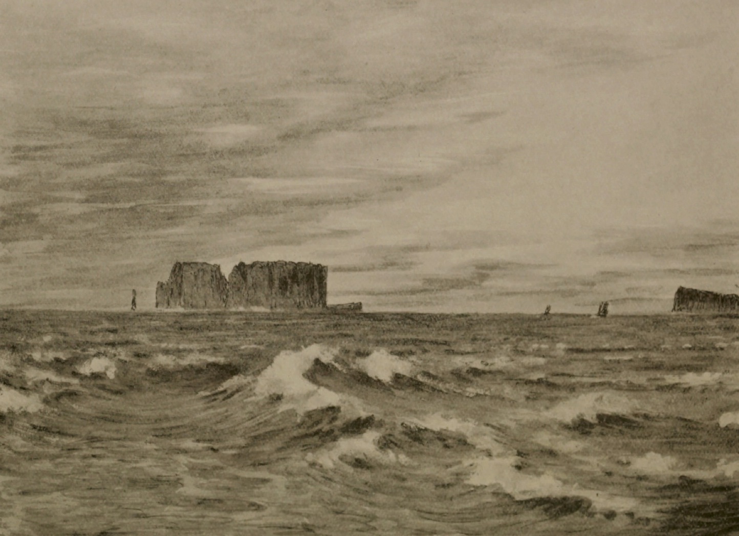 Drangey. Illustration af W.G. Collingwood, (1854-1932). Kilde: A Pilgrimage to the Saga-Steads of Iceland, 1899