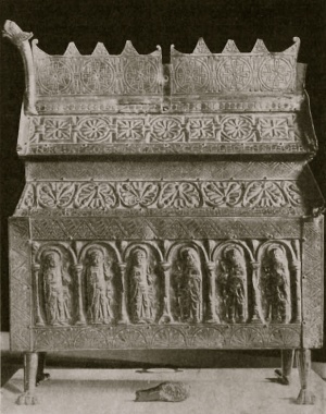 Nu kunna vi visserligen icke påstå, att användningen av uppstående takkammar var något för “fornnordisk” byggnadskonst allena utmärkande. Tvärtom, dylika finnas ej blott å sådana i Norden utförda miniatyrtempel-relikskrin som det från Eriksberg i Västergötland, utan även å talrika liknande romanska och gotiska skrin från kontinenten. Talrika elfenbensreliefer visa också, att liknande huskrön alltid använts av den kristna byggnadskonsten, som ärvt dem från den klassiska. Men det sistnämnda är just, vad som kräves, för att vi verkligen skola ha rätt antaga, att dylika takkrön förekommit i Norden redan under vikingatiden. Ty dess “fornnordiska” kultur — materiell och andlig — är väl icke annat än lån från medelhavskulturerna: lån, som äro mer eller mindre uppenbara, allt eftersom ett kortare eller längre avstånd från inlåningstiden medgivit mindre eller mer genomgripande nationell omformning av det lånfångna.