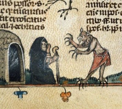 Antonius undrede sig og tænkte over det, han havde set, men fortsatte ikke desto mindre sin færd. Ikke længe derefter får han i en dal øje på en lille mand med en meget krum næse; der voksede horn i panden på ham, og han havde gedebukkeben. Ved dette syn fatter Antonius sine våben som en god stridsmand, og han finder sit skjold og sin brynje, hoc est scutum fidei et loricam spei [14] — det vil sige med troen som beskyttelse og håbet om Gud som styrke. Men dette væsen kastede frugter fra de træer, der kaldes palmer, hen til ham, som om dette skulle være et tegn på næstekærlighed og fred mellem dem. Antonius stopper op og spørger ham, hvem han er, og han får dette svar: »Jeg er,« sagde han, »— en af dem, der holder til i ødemarken, og som hedenske mennesker, der er blevet narret af alskens vildfarelse, kalder en faun, en satyr eller en incubus og dyrker og påstår er deres gud. Jeg vogter min hjord. Vi beder dig om at gå i forbøn for os ved vores fælles Gud, som vi véd fordum kom til verden for at hjælpe menneskene, og hans ord og opfordringer har bredt sig over hele jorderiget.« Da nu dette væsen havde talt sådan, da fældede den gode, gamle mand mange tårer, som strømmede frem af den glæde, han havde i hjertet, for han glædede sig over Jesu Kristi herlighed og over Djævelens ulykke. Han undrede sig også over, at han var i stand til at forstå dette væsens sprog. Han slår nu den stav, han havde i hånden, i jorden og siger: »Ve dig — Alexandria! — fordi du tror på skræmsler og kalder dem gud. Ve dig — by! — som kunne kaldes for en skøge, fordi du stiller din tjeneste til rådighed for alle verdens djævle. Hvad har du nu at sige til dit forsvar? Dyrene kalder nu på Kristus og bevidner hans herlighed, men du kender ham fortsat ikke.« Antonius havde knap fået sagt, hvad han ville, før dette væsen forsvandt, så hurtigt som en fugl kan flyve.