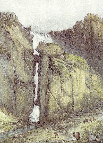 Fljotshlid fra Hlidarende og indefter kaldes Indhliden (Innhlíð); dette parti er, navnlig fra de noget øst for Merkeå liggende gårde Eyvindarmule (Eyviudarmúli)[70] og Åkværn (Árkvörn), meget smukt. Lien har nu mere antaget karakteren af et fjæld, er højere og klippen træder på mange steder frem, men ellers grønklædt, og med få favnes mellemrum styrter sig skummende bække eller småfosse ned over skrænten eller gennem en af de mangfoldige kløfter, hvor endnu hist og her et lille birketræ ses at klynge sig fast, af ualmindelig størrelse og frodighed for disse egne. Udsigten til den grønklædte med de mange hvide bånd prydede li, til dens fortsættelse, det højere, brunlige og mere alvorlige Torolvsfell, derpå til Godalandsjøklen, blå med en betydelig snemængde, der begrænser udsigten mod øst, og til den sneklædte Øfjældsjøkel med violette sider og fod, der først går fra øst til vest og sammen med de oven nævnte fjælde indeslutter en frisk, grøn dal, og derpå strækker sig mod syd med den smukke top Fagrafell og den lodrette Seljalandsfoss for tilsidst at ende i Seljalandsmule, — frembyder altid, når den fornødne klarhed i luften er tilstede, et herligt syn; men dobbelt skønt er det ved solnedgang, når jøkelrødmen kaster sit skær fra fjældenes sne over hele egnen.