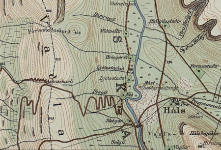 Sydvest for Fornastad, på grænsen mellem Fnjoskadal og Ljosavatnsskard, ligger præstegården Hals (Háls)[12]. Den anselige gård, der står under pynten af et mod nord fremløbende fjæld, som begrænser Ljosavatnsskardet mod syd, har i sin umiddelbare nærhed flere stedsnavne, der minde om tingforhold. Således ligger nord for gården umiddelbart ved tunet en høj, Tinghól (Þínghóll), der igen mod øst og nord begrænses af en lille bæk Tingmannalæk (Þíngmannalækr), som, kommende fra Ljosavatnsskardet, søger ud imod Fnjoskå. Dog findes ikke ved Hals spor af tomter eller andet om et gammelt tingsted vidnende. Heller ikke literaturen giver noget vink. Vel omtales i Ljósv. (s. 76) en forårssammenkomst (einmánaðar-samkoma), som i følge sagaen oprindelig holdtes på Hals, men senere flyttedes til Kaupang (Ef.); men disse for Nord- og Østlandet ejendommelige sammenkomster havde ikke karakter af tingmøder. Det kan i og for sig næppe antages, at noget af fristatstidens ting har været holdt hjemme på denne fra gammel tid bestående gård, og havde det været tilfælde, vilde sikkert i en eller anden form bestemte angivelser derom være bevaret i oldskrifteme. Sandsynligst er det, at navnet Tinghol stammer fra en senere tids tingvæsen. — Navnet Tingmannalæk[13] står måske i forbindelse med benævnelsen Tingmannavej (Þíngmannavegr), som den vej, hvis ene endepunkt er ved vadlerne i Øfjorden, her begynder at antage. Det er den fra Ljosavatnsskardet kommende hovedvej, der fra Hals ligger i sydvestlig retning, over Fnjoskå og videre over Vadla-hede forbi det gamle Vadla-tingsted, om hvilket dens navn utvivlsomt minder. Denne vej er det, som i Ljósv. (s. 83) kaldes Tingmannalejd (Þíngmannaleið).