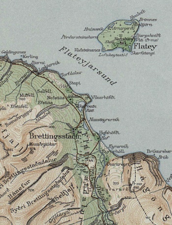 Øst for Gjögratå begynder et nyt præstekald, hvis vestlige del udgøres af de såkaldte Fjorde (Firðir). Denne lille bygd ligger overordenlig afsides og næsten helt afskåren fra omverdenen. Mod nord beskyllels kysten af det åbne hav; fjordene, hvorefter bygden har taget navn, er kun nogle mindre indskæringer, oven for hvilke der i reglen kun er plads for en enkelt eller ganske få gårde; på de fleste steder gå de høje, stejle fjælde helt ud til søen, og som en sammenhængende mur skiller fjældmassen, hvorfra disse er forgreninger, mellem denne bygd og nabobygderne mod øst, syd og vest. Blandt de omtalte indskæringer af havet fortjæne (og have) kun småfjordene Torgejrsfjord (Þorgeirsfjörðr, Bdm.) og Hvalvatnsfjord (Hvalvatnsfjörðr) navn af fjorde. Op fra den sidste ligger en meget besværlig vej mod syd over fjældene til Hövdahverve. I Hvalvatnsfjorden vest for mundingen af en her i fjorden faldende å ligger gården Øre (Eyri), også kaldet Arnarøre (Arnareyri, ældre -eyrr); her har man da rimeligvis det i Finnb. (kap. 22) nævnte Arnarøre, hvor Finnboge efter sit ophold i Norge lander. Som variant forekommer imidlertid Knararøre. — Ved et mod søen fremskydende fjæld er »Fjordene« skilt fra Flatødalen, der tilligemed den foranliggende Flatø udgør præstekaldets anden del. Øst for »Fjordene« antager kystlinjen en sydøstlig retning, og en større bugt Skjalvande (Skjálfandi) eller Skjalvandafloe (Skjálfandaflói ɔ: Skjalvandabugt) — af hvilken sidste form for navnet den første vel kun er en afkortning[5] — begynder at udforme sig. Ud mod en mindre indbugtning af denne store bugt, ved dens nordvestlige hjørne, ligger den nævnte Flatødal (Flateyjardalr), egenlig kun selve kyststrækningen eller dalmundingen, i det dalstrøget længre fra kysten benævnes Flatødalshede (Flateyjardalsheiði, ældre -heiðr). Langs søen ligger derfor også dalens gårde. — Også Flatødalen har sin helt, nemlig Finnboge den stærke, om hvis bedrifter jo rigtignok kun en alt andet end pålidelig saga giver underretning. Her, hvor Finnboges hjemstavn var, omfattes han med megen interesse; dog synes ingen virkelig tradition af nogen art at være bevaret, men adskillige forvirrede forsøg på stedfæstning af de i sagaen nævnte lokaliteter gøres. Vestligst i dalen skyder en høvde sig frem mod søen; inden for denne ligger to gårde Vik og Jøkelså (Jökulsá). Vik (ɔ: Vig), dalens nordvestligste gård, må vel være den Finnb. kap. 36 nævnte lokalitet Vik, hvor en variant har Eyri. Også gården Jøkelså nævnes i sagaen (Finnb. s. 210). Sydøst for Jøkelså ligger Brettingsstad (Brettíngsstaðir), nu dalens anseligste gård, i følge Finnb. tilholdsstedet for Finnboges uvenner. I linje med Brettingsstad, lidt østligere, ligger gården Hov (Hof), rigtignok ikke nævnt i sagaen, men dog ikke uden interesse. Denne gård, der ligger omtrent midt i dalmundingen, ligesom beskyttet af en indadtil græsgrot høvde, som hæver sig op fra søbredden her, har nemlig i sit tun en del tomter af noget usædvanlig art. Alle ligge de nordøst for gården. En af disse udgives for hovtomt; det er en aflangfirkantet tomt, hvis langvægge er c. 6 fv. Men desuden er tunet opfyldt af gamle tomter, om hvis oprindelse intet vides; mindst 6—8 af disse, hvoraf én meget anselig, langt større end »hovtomten«, ligne ganske bodtomter; desuden ses også spor af en kredsformig tomt. Skulde man her have lævningerne af et tingsted? Kilderne mælde intet om noget sådant, lige så lidt som om noget hov i Flatødalen. Dog angiver rigtignok Finnb., at Finnboges fader Asbjörn havde godord i Flatødalen. Foruden de nævnte gårde findes der i selve Flatødalen endnu kun én, nemlig Øre (Eyri, ældre Eyrr), der ligger sydøst for Hov, under dalens østlige fjældbegrænsning og tæt ved søen. På Øre boede i følge Finnbogesaga høvdingen Asbjörn, hvis søn udsættes, men findes af den fattige bonde på Tofter (Tóptir ɔ: tomter), hos hvem barnet opfostres under navnet Urdarkött (ɔ: Urdekat, — fordi han var funden i en urd), indtil dets rette herkomst opdages. Senere får ynglingen navnet Finnboge — efter en norsk søfarende, hvis liv han har frelst. Tofter og Øre kan efter sagaen antages at have været nabogårde; men om beliggenheden af den første af disse vides ellers intet, Øre, der nu kun er en tarvelig gård, står tæt under et grus- og stenfjæld, der danner ligesom den nederste terrasse af et større bagved liggende fjæld. Det nævnte lavere, men dog ingenlunde uanselige fjæld kaldes besynderlig nok Eyrarurð, medens »urð« ellers betegner blot en dynge eller skrænt af løse sten. Oppe på dette fjæld, lige oven for gården Øre, skal findes græsstrækninger; temlig usandsynligt er det dog vel, når man mener, at gården Tofter skal have stået her; man vil imidlertid se spor af gærder og enkelte tuer, der kan tyde på hustomter, her.