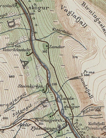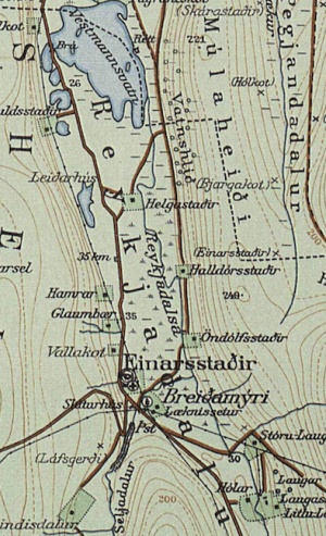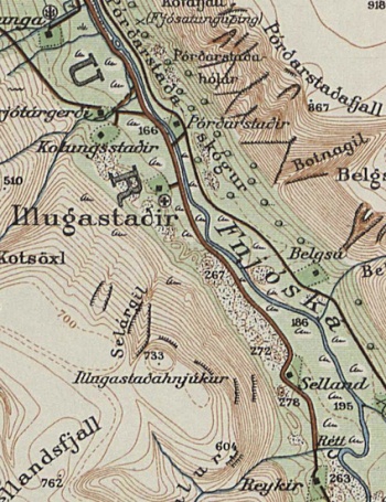 Hele denne egn er skuepladsen for en betydelig del af Vemunds & Viga-Skutas saga og flere partier af Ljosvetninga saga. — I Vem. (s. 231) nævnes således den før nævnte i Reykjadalsmundingen liggende sø Vestmannsvatn, rigtignok i den fejlagtige form Vestmersvatn. Øst for Reykjadalsåen findes oven for søen på en forholdsvis lang strækning ingen gårde, men derefter følge de med korte indbyrdes mellemrum. Den anden i rækken af disse er gården Öndolvstad (Öndólfstaðir), der står under en højde i lien kaldet Öndólfstaðaöxl. Denne gård er utvivlsomt — hvad også A. M. bekræfter — den i Vem. (s. 244, 264) nævnte Öndorsstad (Öndórsstaðir), den voldsomme og urolige Vemunds bolig. På andre steder i sagaen (s. 255, 256) nævnes Vemunds gård Fell (undir Felli); men rimeligst er det vel, at denne betegnelse gælder samme gård (Öndorsstad), på hvilken den jo også i følge ovenstående vil kunne passe. Dog findes ude i Adaldalen et par gårde af navnet Fjall, af hvilke den ene i Bsk. (s. 511—12) benævnes undir Fjalli og i Sturl. vekselvis undir Fjalli og undir Felli. — Efter Öndolvstad følge de to gårde Laugar, Store (Stóru) Laugar nordligst. Forbi Store Laugar fører en vej, der ligger over halsen i østlig retning og således sætter Reykjadalen i forbindelse med Laksådalen og Myvatnsegnen; mod vest fortsættes vejen over Fljotshede til Ljosavatnsskardet. Laugar nævnes én gang i Vem. (s. 316), så fremt ordet ellers her skal forstås som et egennavn, ti den umiddelbart efter nævnte gård Reykir må netop betegne selve gården Laugar. I lien øst for Store Laugar findes mange varme kilder[30]. Aller øverst i dalen mod øst ejer Store Laugar en landstrækning i heden, kaldet Laugatúnga; efter at gården en tid lang havde haft sæter her, er her nu bygget en gård Laugasel. Her mener man med temlig sikkerhed at kunne søge Vem.’s Otveginstunge (Óþveginstúnga, s. 239), hvor fåretyven Hånev boede. Dette bestyrkes især ved de herværende stedsnavne Óþveginsás og Óþeginslækr.