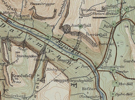 Fnjoskadalen (Fnjóskadalr), ældre Hnjoskadal (Hnjóskadalr), i hvis nedre del man her stiger ned fra heden, er allerede tidligere nævnt, og ved samme lejlighed omtaltes foreløbig den dalen gennemstrømmende Fnjoskå (ældre Hnjoskå). Med undtagelse af dalens allernederste parti, den fra øst til vest liggende »Dalmunding«, strækker den lange, smalle Fnjoskadal sig — i en længde af 5 mil — i retning fra nord til syd op mod det indre højland, længst imod syd forgrenende sig i tre ubeboede sidedale, af hvilke den vestligste endog skal være lige så lang som hoveddalen [9]. Af tilløb fra disse dale dannes Fnjoskåen, der altså har en betydelig strækning at gennemløbe, inden den kan udmunde i Øfjorden. Skønt ved midsommerstid af udseende og karakter kun som en middelstor å skal Fnjoskåen virkelig en stor del af året føre en betydelig vandmasse og ved forårstid regelmæssig være ufarbar for ridende, og selv i sommertiden befares den kun på regelmæssige vad, hvoraf der rigtignok er adskillige. Til bægge sider begrænses Fnjoskadalen af sammenhængende fjældhøjder; kun mod øst afbrydes disse ét sted — omtrent midtvejs — kendelig af en tværdal Ljosavatnsskard (Ljósavatnsskarð), der danner en bekvem forbindelse mellem Fnjoskadalen og den øst for liggende bygd; dog findes foruden dette pas til bægge sider flere mindre »skår« (skörð), hvorigennem vej ligger over fjældene. Den nedre, nord for mundingen af Ljosavatnsskardet liggende del af Fnjoskadalen står i henseende til naturskønhed tilbage for den øvre (sydligere) del, hvor den stærkere udprægede fjældbegrænsning og den frodige skovvækst meddeler egnen en ejendommelig skønhed. Også den nedre del af dalen er dog en ret køn bygd, med en tæt række af gårde på hver side af åen. Denne del af dalen er skuepladsen for den i Ljósv. s. 80—88 omtalte kamp mellem Eyjolv Gudmundssön (senere kaldet »den halte«) og Ljosvetningerne. Den nordligste af de ved denne lejlighed nævnte gårde i Fnjoskadal er Dravlastad (Draflastaðir)[10], der ligger vest for åen, et par »gårdlængder« syd for hvor Fnjoskadalen går over i Dalmundingen. På Dravlastad får Eyjolv underretning om, at hans fjender har samlet sig på den, hinsides åen, sydøst for Dravlastad liggende gård Vejsa (Veisa) [11]. Eyjolv og hans mænd søger forgæves at komme over åen, folkene fra Vejsa med deres overlegne styrke er ham overalt i vejen. Ved denne lejlighed nævnes vadestederne Hestavad (-vað) og Tredjungavad (Þriðjungavað), af hvilket sikkert det første, og måske også det andet har ligget på strækningen nord for Ljosavatnsskardet; dog er intet af navnene bevaret. Bægge partier får efterhånden forstærkning, og sluttelig drager en betydelig styrke Ljosvetningerne til undsætning ned langs bægge sider af åen. Nu kommer det til den afgørende kamp ved højen Kakalahól (Kakalahóll), hvor der var en fugtig mose og et vandløb (lækjarfall). Denne høj skulde man efter sagaens fremstilling måske snarest søge øst for åen; rigtigst bliver det dog vistnok at antage, at den har ligget vest for åen, hvad heller ikke ligefrem modsiges af sagaen, øst for åen findes der nemlig på hele strækningen nord for skardet intet sted, som passer til sagaens beskrivelse; vest for åen er der heller ikke mange høje eller bakker at vælge imellem. Ubetinget bedst passer til sagaens beskrivelse den såkaldte Orrustuhóll (ɔ: kamphøj), der også ved sit navn minder om en her stedfunden kamp. Det er en høj og stejl grusbanke, der strækker sig ud mod åen, syd for gården Dæle (Dæli), omtrent lige over for Vejsa. Mellem højen og åen findes mosedrag, og tæt under højen ligger et kær, der ved et dyndfuldt udløb står i forbindelse med åen. I Finnb. (kap. 38), hvor der hentydes til samme begivenhed, kaldes højen Melrakkahóll, men dette navn er lige så lidt som Kakalahóll bevaret. — Blandt de sydligere gårde vest for åen i denne del af dalen er den omtrent i linje med Ljosavatnsskardet stående gård Nés (Ljósv. s. 86). — Øst for åen kan foruden Vejsa nævnes Fornastad (Fornastaðir), hvor i følge Ljósv. Torgejr godes sønnesøn Torvard Höskuldssön, som den gang stod i spidsen for Ljosvetningerne, boede — en gård, der måske rettere kan siges at ligge i Ljosavatnsskard.