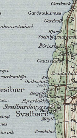 Medens på Øfjordens vestkyst flere fjorde og adskillige større dale strække sig ind i landet, er fjordens østkyst kun lidet indskåren. Fjorde findes her slet ikke, og kun ét sted afbrydes den tæt ud mod kysten gående sammenhængende fjældmasse ved et dalstrøg, i det Fnjoskåen omtrent midtvejs på østkysten bryder sig vej ud til fjorden. Den et par mile lange kystrand, der fra syslets sydgrænse ligger nord på langs Øfjordens østkyst til Fnjoskåens munding, benævnes Svalbardsstrand (Svalbarðsströnd), mod øst begrænset af Vadlahede, der som en svær hals skyder sig frem mellem kysten og den øst for liggende Fnjoskadal. Vejen nord på går ad ubanede stier langs den stejle skråning. Det smalle underland langs kysten giver kun plads for en enkelt række gårde; den sydlige, større halvdel af disse, til bægge sider for kirkestedet Svalbard (Svalbarð), udgør i gejstlig henseende et annekssogn til Glæsebæ i Øfjords syssel. Foruden Svalbard, der nævnes i Ljósv., er der ikke mange punkter her, der fortjæne særlig at fremhæves. Det i Ldn. (s. 206) nævnte Galtarhamar(r), hvor Helge den magre landede på sin sejlads længre ind i Øfjorden, må vistnok søges i Svalbards sogn, men navnet synes at være glemt. Ved gården Gautstad (Gautstaðir) noget nord for Svalbard omtaler den antkv. indb. (1817) syd for tunet et sted kaldet Tinggerde (Þínggerði), bestående af en gammel »domring« med spor af en tomt i midten; dér skal langt ned i tiden have været afsagt domme, og i et vandhul der i nærheden skal en kvinde være druknet på grund af barnefødsel i dølgsmål og udsættelse af barnet. Tingstedet er, hvad også denne sidste beretning tyder på, utvivlsomt af nyere oprindelse. — Omtrent på grænsen af Svalbards sogn og det nordligere Løvås sogn skyder et lille næs Knararnes sig frem i fjorden; stedet er bekendt som en ypperlig landingsplads, og her er udmærket læ for skibe under alle vinde. Det er vel rimeligst her at søge det Knararøre (Knarareyrr) i Øfjord, som omtales i Vem.; et landingssted af samme navn forekommer Finnb. (kap. 10).