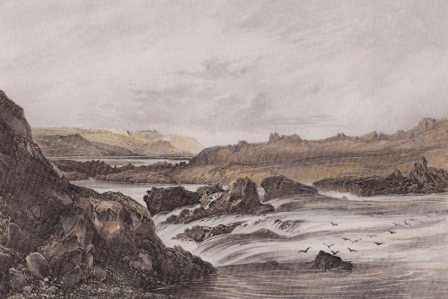 Den alt flere gange nævnte elv Jøkelså (Jökulsá), vistnok Islands længste, til forskel fra andre Jøkelsåer kaldet Jøkelså på Fjældene (Jökulsá á Fjöllum), eller, efter den bygd, hvor den falder i søen, Jøkelså i Aksarfjord (Jökulsá i Axarfirði), udspringer fra en skridjøkel, som Vatnajøklen sender ned mod nord [47]. Under sit hele løb har den en afgjort nordlig retning, om end (i følge Watts) med flere bugtninger end kortet antyder. Indesluttet af nøgne, af vulkansk sand bestående bredder, hvor lavablokkene eller klippegrunden hist og her stikker frem, skyller den sine skidengrå vande i en tilsyneladende jævn, men stærk strøm fremad. Indtil noget nord for Myvatnsbygden danner denne Sønder-Tingø syssels østgrænse, som herefter bøjer mod vest.