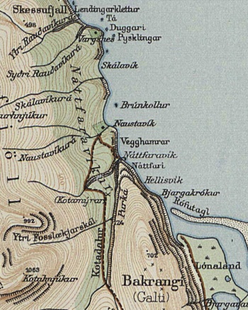 Efterhånden som Skjalvandafljot nærmer sig nordkysten, bøjer elven svagt imod vest, til den sluttelig falder i søen ved Skjalvandabugtens sydvestlige hjørne. Det gamle udløb skal have været lidt vestligere end det nuværende, og man skal der se spor af gamle skibsskure (naust). Virkelig véd også Ldn. at berette om forskellige landinger i Skjalvandafljotsós (Skjálfandafljótsóss). — Fra Skjalvandafljots udløb, mod nordvest til Flatødalens østlige begrænsning (fjældet Ódeila), ligger langs kysten høje og stejle fjælde. Denne et par mil lange strækning, hvor nogle småvige hist og her skærer sig ind, benævnes tilsammen Natfarevigene (Náttfaravikr), skønt navnet Natfarevig (Náttfaravík) egenlig kun tilkommer vigen nærmest Skjalvandafljot. Denne strækning er almenning med undtagelse af dens sydøstlige del, hvor et par gårde findes. Natfarevig bærer som bekendt i følge Ldn. navn efter Gardars uheldige ledsager Natfare. Om en herværende klippe, der skulde være den til sten forvandlede Natfare, beretter allerede Egg. Olavsson (Enarrationes s. 120). På et udførligt kort — i Oldn. museums antkv.-topogr. arkiv — over Natfarevigene ses i den egenlige Natfarevig »Náttfari« som en fritstående klippe oppe på land i strandkanten; lidt øst for findes ved strandbredden to til sten forvandlede nattrolde (Karl og Kerling, to »dranger«).