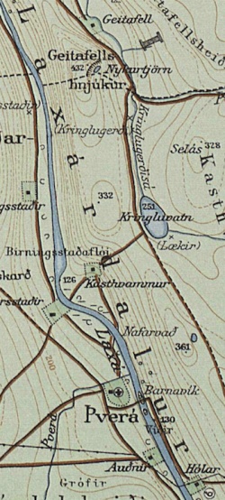 Mellem Fnjoskadal og de østligere egne er, som oftere nævnt, det smukke og bekvemme Ljosavatnsskard en ypperlig forbindelsesvej. Dette, der aldeles har karakter af en smal dal, skærer sig omtrent midtvejs i sydøstlig retning ind gennem den ellers fra det indre højland til helt ud til kysten sammenhængende fjældmasse. Dalens vestlige del, nærmest Hals, er græsrig og bakket; her har man de to gårde Tjarnir, Lille (Litlu) Tjarnir — forbi hvilken den sædvanlige vej fører — nordligst. Store (Stóru) Tjarnir — ved hvilken der findes en varm kilde (laug) — sydligere i dalen. Den i Vem. og Ljósv, nævnte gård Tjarnir er snarest Lille Tjarnir. Store Tjarnir synes nemlig at måtte svare til den i Vem. oftere (s. 255-65) forekommende gård Laugar; tilstedeværelsen af en »laug« ved gården gør det jo også forklarligt, at den tidligere kan have været benævnt herefter, og de nøjagtige angivelser i sagaen, hvor denne gård Laugar nævnes, tillader næppe antagelsen af nogen forveksling [18]. — Den østlige del af dalen optages næsten helt af den fra øst til vest liggende sø Ljósavatn, langs hvis nordlige bred vejen går. Noget øst for søen ligger den efter denne benævnte gård Ljosavatn (Ljósavatn). Som bolig for Torgejr gode, hvis berømteste gerning er gennemførelsen af kristendommens vedtagelse på altinget år 1000, men som desuden spiller en stor rolle i Vem. og Ljósv., er gården bleven meget bekendt. Man vil i tunet vise gudehusets plads; oven for, uden for tunet, findes en fra fjældet udgående høj Tinghól (Þínghóll) — om navnets ælde vides intet; det må vel snarest henføres til en senere tid end fristatstiden, og med hensyn hertil kan bemærkes, at gården også nu er tingsted[19].