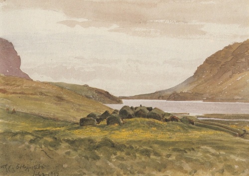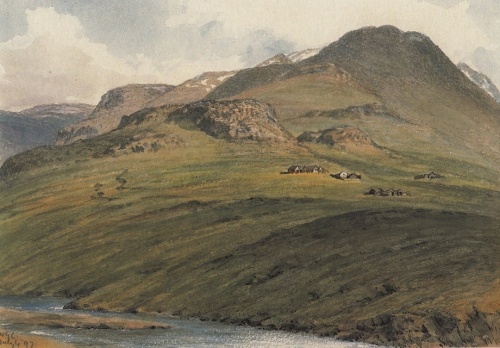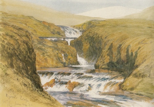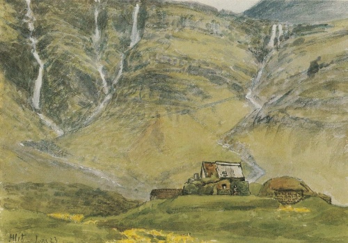 Hinsides Vadilshøvde med tilhørende højdedrag kommer igen en lille dal, hvori gården Örlygsstad (Örlygsstaðir) ligger. I følge Eb. solgtes denne gård af Torolv til Ulvars broder Örlyg, der ligeledes var Torbrandssønnernes frigivne; da Ulvar og Arnkel efter Örlygs død tog al dennes ejendom i besiddelse, foragedes end mere Torbrandssønnernes forbitrelse. Efter Ulvars død måtte Arnkel selv drive bægge disse gårde foruden sin egen, da ingen fæster af frygt for Torbrandssønnerne turde overtage dem; en vinternat, da Arnkel var beskæftiget med at flytte hø hjem fra Örlygsstad, overfaldes han her af Snorre gode og Torbrandssønnerne og falder efter en heltemodig modstand i høstaksindhegningen[62]. Hans trælle derimod viste en næsten idiotisk sløvhed eller forfærdelse, en af dem, Ofejg, blev så forfærdet, at han løb til fjælds og styrtede sig i den efter ham benævnte foss. — Den sidst nævnte lille dal gennemstrømmes af Örlygsstadaå (Örlygsstaðaá)[63]; omtrent lige over for Örlygsstad, hinsides åen, har gården Hella (Eb. s. 119) stået. (I A. M. udtales, at, efter hvad man mener, skal der fordum have stået en gård kaldet Hella, hvor der nu er stekk fra Örlygsstad, men som antoges ikke at have været bebygget, siden Örlygsstad bebyggedes.) Neden for Hella skulde i følge Eb. sumpen Glæsiskelda findes, hvori troldtyren fra Alvtafjord, i hvilken Torolvs djævelske natur for sidste gang kom til udbrud, forsvandt, således som senere nærmere vil blive omtalt. Neden for det holt, hvorpå gården har stået, findes i engene syd for fjorden mange mosehuller og dyndpytter, hvoraf især et nærmest Hella er farligt for kreaturerne, dette, antager man, er Glæsiskelda.