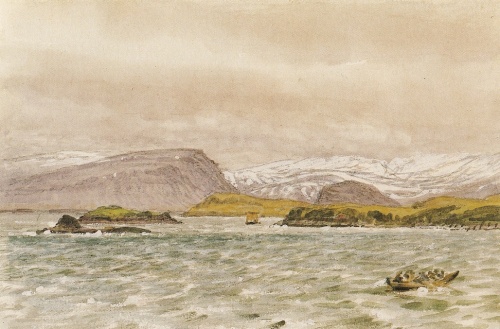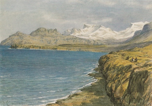 mod øst svære trapdannede fjælde, kronede med store klippeknuder, mod sydhalvøens sammenhængende til dels sneklædte fjælde, neden under hvilke det smalle, men frodige lille kystland strækker sig. Her ved fjordens sydøstlige hjørne ligger bygningerne af den forrige handelsplads Grundarfjord, der benyttedes som sådan til hen imod midten af dette århundrede, men siden den tid har handelen for stedets beboer kun været et bierhverv eller været helt opgivet. Fjorden har navn efter gården Grund, der lå øst for handelsstedet, men som har ligget øde siden slutningen af forrige århundrede, da ejendommen erhvervedes til brug for handelsstedet; den er bekendt som en god og sikker ankerplads[22]. Nordøst for handelshusene falder en lille å Grundarå (Grundará) i jorden; under den nederste del af sit løb, hvor den er adskilt fra stranden ved en høj rullestenskam, breder den sig endél; derved dannes et godt vinterleje for selv større skibe, som med flod kan føres herop. I Eb. omtales på to steder (s. 21, 36) en Saltøreós (Salteyraróss), hvor handelsskibe lander; den synes at måtte søges i den vestlige del af Eyrarsvejten, men om dens beliggenhed opstilles forskellige formodninger. Nogle antager den for at være udløbet af Grundarå; måske man dog med fuldt så stor rimelighed kunde antage den for at være udløbet af Halsvadal, vigen mellem Kirkefell og Stöd. Ved dette udløb, hvor vigen stærkt indsnævres, er forholdene meget gunstige for skibes landing og losning, navnlig ved osens vestlige, stejle bred, der bærer navnet Kviabrygge (Kvíabryggja); osens østlige begrænsning Budatange (Búðatángi) minder ved sit navn om tidligere tiders handelsrørelse. Sydøst for Kirkefell er vel også en lille, efter fjældet benævnt, vadal, men mindre og ubetydeligere; her findes dog også om handelsforhold mindende stedsnavne, nemlig to åer af navnet Budaå (Buðaá) [23].