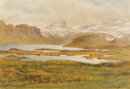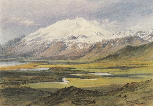 Oven for Stapafell findes i en fjældskråning ikke synderlig højt oppe den bekendte Sanghule (Sönghellir), således benævnt på grund af den her herskende stærke genlyd. Hulen nævnes i BSnf., men er bleven almindelig omtalt ved de binderuner og andre tegn, der findes indridsede i hulens vægge. Hulen er beskrevet i E. O. s. 273, uden at der dog udtales nogen mening om indskrifternes betydning. Jonas Hallgrimsson har senere besøgt den: i følge hans indberetning til F. Magnusson var de på de hurtig forvitrende klippeflader endnu bevarede indskrifter (binderuner, bomærker, forbogstaver, årstal) for største delen nye, og noget udbytte af gamle runetegn her ikke at vente. — Fra Stapen fører vejen over et lille hraun med stærke hævninger og sænkninger til fiskerlejet Hellnar eller, som navnet oprindelig lød, Hellisvellir (A. M.). I følge ÞK. (s. 364) må dog Hellisvold (Hellisvellir) i ældre tid have haft en noget mere omfattende betydning, da Laugarbrekka-land siges at ligge på Hellisvold. Hellnar er en grøn, ret venlig plads tæt under jøklen, som man nu ser fra isse til fod. Herfra synes kun den mindste del af det blålige kompakte fjæld bedækket med sne, og snelaget forholdsvis tyndt, da ligesom knuder eller knapper hist og her stikke frem; på frastand synes jøklen både større, regelmæssigere og mere imponerende end nær ved, hvor man som ved andre lignende ubrudte fjæld- og jøkelmasser skuffes af deres tilsyneladende forholdsvis ringe højde; i virkeligheden er dette jøkelfjæld over 4500 f. og altså et af Islands højeste fjælde. — Vest for Hellnabygden strækker en smal dalsænkning sig op mod fjældene; her ligger gården Laugarbrekka med tilhørende kirke, tidligere en af de anseligste gårde i denne egn, nu efterhånden i den grad ødelagt ved slet behandling, at ingen kan eller vil drive den, så at den for øjeblikket ligger øde. I Ldn. (s. 83 — 86) fortælles om to herværende høje (landnamsmandens og hans søns), Sigmunds og Ejnars, af hvilke den sidste bestandig var grøn; men om disse vides nu næppe noget. I BSnf. gøres Laugarbrekka til Bård Snefjældsas' bolig, så længe denne endnu opholdt sig i bygden blandt andre mennesker[9]. Noget vest for Laugarbrekka løber Dagverdarå (Dagverðará), et ubetydeligt vandløb, men mærkeligt som det eneste på hele jøklens sydside, der fører jøkelvand. I tunet på gården af samme navn viser man et minde om en af personerne i BSnf., Torkel Skinnvevjas skåletomt.