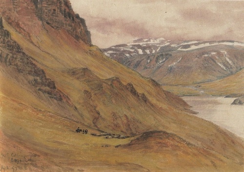 men er måske Eb.'s Digremule (Digrimúli), inden for hvilken den fornærmede ægtemand en gang havde lagt sig på lur efter Bjørn, da denne begav sig tilbage fra Frodå[17]. Senere fortælles i sagaen, at Bjørn en gang på hjemvejen fra Frodå overfaldes af en snestorm, så at han flere dage må opholde sig i en klippehule. Til dette eller lignende sagn knytter sig formodenlig stedsnavnene Björnshellir og Björnshlaup, der skal flndes inden for mulen, og Björnsmýri, oppe på heden. — Efter kristendommens indførelse lod Torodd bygge en kirke på Frodå; også nu er gården kirkested. — Mest bekendt er dog Frodå bleven ved Eb.'s fortælling om de vidundere og gengangere, ledsagede af stor dødelighed, der, efter at være bebudede ved en »urdmåne«, som viste sig på skålens indre væg, længe plagede gården, indtil Snorre gode fordrev dem ved en lovformelig stævning. — Frodå med tilhørende besiddelser er en anselig ejendom, der helt optager lavlandet omkring Frodå, med et fællesnavn kaldet Frodåhverve (Fróðárhverfi). Mod øst begrænses denne lille bygd af et fjæld, Vallnafjall, der her skyder sig frem fra højlandet; neden for fjældet ligger fladere strækninger ud imod søen: først et par småholt, så lavland. Neden for holtene, nordøst for osen, ved søen, og på den anden side begrænset af en lille å, ligger gården Haugabrekka; dette sted svarer uden tvivl til Eb.'s Haugabrekkur, hvor der i følge sagaen holdtes en talrig sammenkomst, der også besøgtes af folk fra halvøens sydkyst[18]. — Når man er kommen forbi Vallnafjældsmulen, viser sig den øvrige del af det flade næs neden for denne, her ligger fiskepladsen Brimilsvellir; og man ser nu ud over en anden lille bugt — svarende til den fra Olavsvig til Brimilsvellir — med tilhørende kyst, mod øst begrænset af den sig der fremskydende Bulandshøvde (Búlandshöfði). Dette fjæld, ikke synderlig mindre berygtet end Enne, og som sammen med sidstnævnte næsten fuldstændig aflukker den indre Næshrepp fra omverdenen, ses som en tung, stejl fjældryg at strække sig umiddelbart ud til søen og med sin nederste del at falde brat af mod denne; ned mod denne lodrette væg skråner den øvre del af fjældmulen i forskellige afsatser under konkave vinkler. Over Bulandshøvde ligger den eneste vej, som fra denne bygd fører mod øst; om vinteren, når frost eller sne gør den ufremkommelig, har den vejfarende intet andet valg end gående ved ebbetid at se at nå frem neden under høvden, for så vidt han ikke vil foretrække at gå en omvej ved at tage syd på tværs over halvøens højland og så tilbage igen over dette ad en af de østligere fjældveje (en indsænkning bag om høvden (Höfðaskarð) fortjæner nemlig næppe navn af vej). Når man fra fjældlien vest under Bulandshøvde når op i selve høvden eller mulen, ligger vejen temlig vandret i fjældskråningen, noget oven for hvor denne støder sammen med høvdens nederste lodrette væg og omtrent midtvejs i fjældet. Fra vejen ses den nedre del af klippevæggen på grund af sin stejlhed ikke, derimod ses søen neden for høvden, hvad der vel kan gøre et noget uhyggeligt indtryk; ellers synes vejen i al fald om somren ikke så særdeles farlig, da stien er tydelig udtrådt og nogenlunde bred. Men ganske vist må man helst ønske sig fri for medrejsende på høvden.