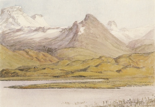 men vest for udløberen, noget lavere nede, vises stedet, hvor gården fordum stod [5]. Her boede i følge Ldn. (s. 81) i sin alderdom Asmund fra Langaholt; efter hans død boede hans enke Tora der, berømt for sin gæstfrihed, så at hun endog byggede sin skåle tværs over landevejen, holdt stadig dækket bord dér og sad selv og indbød gæster. Asmund blev højsat i et skib i Ásmundarleiði og en træl medgivet ham, indtil den døde tilkendegav sit mishag herover, hvorefter trællen fjærnedes. Asmunds grav vil man endnu påvise, dog er man ikke ganske enig om den nøjagtige beliggenhed; snarest synes navnet at være knyttet til et temlig stort herværende holt. Hinsides det mod syd udløbende Öxlfjæld ligger Bredevigen (Breiðavik), en smukt afrundet lille dal, begrænset af det omtalte Öxlfjæld eller Axlarhyrna, højlandet bag ved og, længst mod vest, Snefjældsjøklen med det foran liggende isolerede lille Stapafell, — grøn og frodig, med vid udsigt over søen; sit navn tager bygden efter en jævnt rundet bugt eller vig, som her skærer sig ind på halvøens sydside. — Hvor Öxlfjældet mod vest skiller sig ud fra højlandet, ses i fjældskråningen et lille stejlt skard, ikke stort andet end en kløft; dette er Egilsskarð, i følge Eb. (s. 79) benævnt efter trællen Egil, der dræbtes her, da hans forsøg på at ombringe en af de til boldleg neden for skardet forsamlede Bredvikinger, som han fra dette sit ophøjede stade havde udspejdet, var mislykket. Neden for det gennem kløften nedstyrtede stenskred strækker sig tørre græssletter, der fortsætter sig i moser, indtil disse støder til det syd for liggende Búðahraun. De omtalte græssletter, der nu kaldes Skarðsvellir, er Eb.'s Lejkskålavold (Leikskálavellir), hvor bygdens folk samlede sig til boldleg og byggede store legeskåler; stedets beskrivelse i Eb. (s. 77) er meget nøjagtig;[6]. — Følges derefter vejen langs under fjældene mod vest, kommer man først til Tord bligs bolig Knörr (Eb. s. 71), med tilliggende jorder en af de betydeligste ejendomme i disse egne[7]. Syd for Knör ligger neden for den vestlige del af Budahraun gården Hraunlönd. I Eb. (s. 21) fortælles, at bonden fra Frodå sendte en mand syd over heden