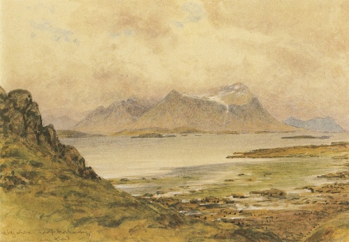 (utvivlsomt Frodåhede) til »under Hraun«, hvor Spå-Gils boede, for at søge råd hos denne. Nu findes ingen gård Hraun her i egnen, men den oven nærnte gård Hraunland er den, der på grund af sit navn og sin beliggenhed snarest kan antages at være den i sagaen omtalte. — Vest for Knör ligger gårdene Kamb (Kambr); den fra Eb. bekendte Bjørn Bredevigskæmpe antages at have bot på Store Kamb (Lille Kamb er nu i øde). Gården står umiddelbart under fjældene ved foden af en lav derfra nedskrånende ryg. Oven for Kamb ligger et skard (Kambsskarð) op i fjældene; langs dette går en, nu sjælden benyttet vej, der forbinder denne gård med den nord for liggende gård Frodå; i det vejen fra heden farer ned gennem skardet, bøjer den af umiddelbart ned mod tunet på Store Kamb, så at fremstillingen i Eb. (s. 90), hvorledes Snorre gode ved nedridningen fra heden overrasker Bjørn arbejdende i tunet, viser sig nøjagtig svarende til forholdene her. Hedevejen kaldes i Eb. Kambshede (Kambsheiðr). — Vest for Kamb laber den lille Gravarå (Grafará); vestlig ved denne ås udløb vises to tomter, kaldet »irske« tomter, hvorfra Irerne i tidligere tid skal have handlet. — Fra nu af indsnævres kystlandet igen og højner sig umærkelig; snart falder kysten med en lodret klippeskrænt af mod søen, og fra højlandet løber nær ved hinanden flere smååer og bække ned til havet og danner alle, hvor de styrter ned fra skrænten, smukke fosser. Snefjældsjøklen viser sig som en hvælvet, noget tilbageliggende og, på grund af fremstående knuder, noget ujævn hætte, hvis neden for liggende sneløse parti går umiddelbart i ét med halvøens fjældkæde, og hvorfra en lavastrøm ses at have væltet sig ned imod syd. Foran jøklen står det mindre, nøgne, spidst-kegleformige fjæld Stapafell, og neden for dette skyder et grønligt næs sig frem, hvorpå fiskerlejet Stapen (Stapi) står. Den stejle kystskrænt ud mod havet, umiddelbart før man kommer til Stapen, — med rugende mågearter på klippehylderne — bærer navnet Sölvahamar. Denne egns landnamsmand boede først på Brenning (Brenníngr), senere på Sölvahamar, fordi han mente dér at kunne være andre mere til nytte (Ldn. s. 82 — 83). Overensstemmende hermed vises hans hustomter på Sölvahamar på begge sider af vejen. Hans første bolig Brenning skal i følge sognebeskrivelsen have ligget lidt længere nede; i A. M. nævnes Brenning i Arnarstape land som et sted, hvor gamle bygningslævninger fandtes[8]. — Selve Stapen eller, som navnet nøjagtigere lyder, Arnarstape (Arnarstapi — efter en uden for kysten fritstående klippe) er nu kun en almindelig fiskerplads, ikke i nogen henseende forskellig fra de øvrige omkring Snefjældsjøklen; fælles for dem alle er den yderligste fattigdom og trang, bevirket ved det i de senere tider her højst usikre og, som det synes, stedse aftagende fiskeri. Oprindelig var Arnarstape en hovedgård (ÞK., BSnf.), hvoraf de forskellige fiskerhuse har udviklet sig. Efter gården bærer det betydelige kgl. jordegods i Snf. navnet »Arnarstape ombud«, i følge GhM. I, 457, fordi godsets første kgl. forvaltere havde deres bopæl her. — Tidligere dreves fra Snefjældsnæsset det måske vigtigste fiskeri på hele Island; — syd for jøklen var fisketiden især om foråret, nord for jøklen også hele vinteren igennem.