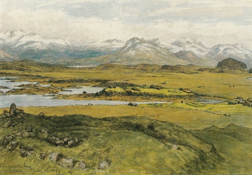 Påfaldende er det at se så gamle og pålidelige kilder som Ldn. og Eb. udtale sig på en så sagnagtig måde om domkredsens benyttelse, da dog både brugen af en domkreds som den dommerne omgivende skranke kan antages at have vedvaret, så længe de gamle retsformer bevaredes, og på den anden side en sådan dømmen til ofring i domkredsen og henretten sammesteds må synes uforenelig med oldtidens love og samfundstilstande. — Den beskrivelse, der således i sagaliteraturen er givet af domkredsen på Torsnæs ting med tilhørende blótsten, har imidlertid bevirket, at dette tingsted længe har tiltrukket sig almindelig opmærksomhed, så meget mere som adskillige tomter fra ældre tid findes bevarede her. Tingstedet ligger, hvad der også passer til kildernes angivelse, i den nordøstlige del af Torsnæs, og efter den fordums tingslette fører en her beliggende gård navnet Tingvold (Þíngvellir). På den nordøstligste del af næsset skærer en lang, smal vig Næsvåg (Nesvogr) sig ind[47]. Lidt sydligere end dennes munding går en lille klippehøjde ved navn Tingvoldborg (Þíngvallaborg) ud mod søen; neden under (ɔ: syd for) dette holt begynder fladt og sumpigt land, der strækker sig hen imod gården Tingvold. Denne ligger lige ved bunden, men dog på nordsiden af en smal, lille våg Tingvoldvåg (Þingvallavogr), og tunet strækker sig som en lang grønlig strimmel langs den nordlige og sydlige side af vågen, kun afbrudt på en kort strækning i jordbunden. Gudbr. Vigfussön har sikkert ret, når han[48] antager, at det er denne gård, der menes i Eb. s. 12, hvor der — efter at tingflytningen er omtalt — fortælles, at Torsten torskabit lod bygge gården Helgafell, hvorhen han selv flyttede, og derpå fortsættes: »han lod også bygge en gård dér i næsset i nærheden af, hvor tinget havde været, den gård lod han også meget omhyggelig opføre og gav den siden til sin frænde Torsten surt, som derefter boede dér.« Han forudsætter nemlig, at der efter ordene »havde været« (ɔ: var bleven) mangler ordet sat eller flyttet. Dette kan heller næppe være anderledes; ti uden en sådan tilføjelse måtte fortællingen gælde Hovstad, men denne var jo allerede tidligere opført (af Torolv Mostrarskegg, og utvivlsomt bebot af sønnen Torsten Torskabit indtil dennes flytning til Helgafell). Tingvold antages for oprindelig at være opført i Helgafells land; dog kan det vel være, at gården ikke har været bebygget bestandig siden dens første opførelse, eller at den som en art hjåleje er bleven regnet umiddelbart med til hovedgården, i Helgafells landemærkefortegnelse fra c. 1250 findes den således ikke nævnt. Torsten surt, der er bekendt for sin kalenderforbedring (han indførte den for den islandske kalender ejendommelige indskudsuge »sommerøgningen«, der hvert 7de eller 6te år føjedes til det sædvanlige år), nævnes oftere i kilderne, men uden at hans bolig nærmere angives; i Laxd. siges i almindelighed, at han boede på Torsnæs, og sagaen fortæller (s. 56), at han druknede, da han var i færd med bortflytningen fra Torsnæs, hvor Torsten Torskabits sønner var blevne ham for mægtig. I det til Tingvold gård hørende tun findes, så vel syd som nord for vågen, en mængde tomter, øjensynlig rester af de gamle tingboder.