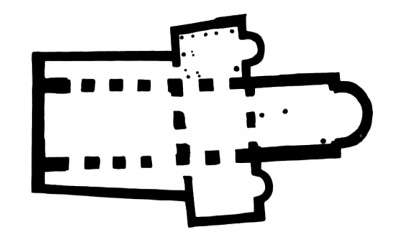 Vi ha också exempel på jordfynd av stavkyrkostolpar inom romanska stenkyrkor i vårt land. Varför skulle stolphålen i Gamla Uppsala vara annat än stavkyrkospår? Intet av de funna hålen faller utom den romanska stenkyrkans murar, och på det ställe, där en helhet på 5 stolphål är bevarad (innanför norra korsarmens nordmur), skönjes tydligt träkonstruktionens relation till stenbyggnaden: stolpraden och stenväggen är parallella (fig.). Det är svårare att förklara detta som en slump än somett ändamålsbetingat faktum. Vi se hur en yngre kyrka tar hänsyn till en äldre — en välkänd regel inom kyrkobyggnadskonsten. I själva verket får stenmurens skevhet sin förklaring av här påvisade faktum. — Ett annat ur min synvinkel betydelsefullt fynd är den äldre kyrkogård med kristna gravar, vilken Lindqvist iakttagit i anslutning till den äldre bebyggelsen under den nuvarande kyrkplatsen. Den har kommit Lindqvist att räkna med en stavkyrkoperiod före stenkatedralens tid. Av denna stavkyrka har han likväl ej funnit några spår. Beviset för stolphålens och därmed också hednatemplets ålder skulle, så vitt man nu kan förstå, ligga i fyndet av en lös fornsak, ett fragment av en gjutform för ett spänne av 900-talstyp. Man frågar sig, hur det är möjligt att tillmäta detta fynd så stor betydelse som skett i detta sammanhang. De iakttagna »stolphålen» efter stolpar med en genomskärning av »70 cm eller mera» förefalla också gåtfulla i en rekonstruktion av — låt vara aldrig så monumental — träarkitektur.