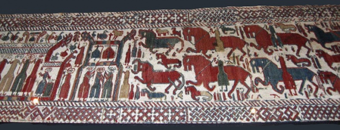 Gentemot båda de nu nämnda tydningarna har av framställarna själva anmärkts dels den viktiga omständigheten, att figurerna sakna glorior och dels att de genom sin isolerade placering ha föga sammanhang med bildframställningen i övrigt. Figurernas karaktär av heliga hjälpare för de kristna anses emellertid framgå av det som kors uttydda föremål, vilket bäres av den mittersta figuren. Den rätt självständiga scen, som figurerna bilda för sig, anses bero på att personen, som vävt detta parti, är en annan än den som vävt bonaden i övrigt.