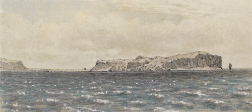 Myrdalen (Mýrdalr) eller, som den i ældre tid benævntes, Mydal (Mýdalr) er Vester-Skaftafells syssels vestligste bygd. Den strækker sig lang og smal under de Myrdal-Eyjafjallajøklen bærende fjælde og gennemstryges navnlig for den midterste dels vedkommende af adskillige udløbere herfra. Den falder i tre dele. Ud-, Mid- og Øst-Myrdal (Út, Mið- og Austr-Mýrdalr), af hvilke den sidste når fra det, fra nord til syd fremløbende Reynisfjæld ( — fjall) til omtrent midtvejs på Myrdalssand, hvor Eyjarå sædvanlig tidligere anførtes som østgrænse. — Over den c. 5 mil lange, 4 mil brede, nu aldeles flade Myrdalssand føre flere veje til nabobygderne mod øst og nordøst, af hvilke hovedvejen mod øst (til Alvtaver) er antydet ved nedrammede pæle. Den sorte sandslette er gennemstrømmet eller overrislet af forskellige jøkelåer og bække med vekslende leje og højst forskellig størrelse. Op fra sandstrækningen hæver sig enkelte fritstående småfjælde, til dels krat- og græsbevoksede og derfor aldeles som oaser i ørkenen. Længst imod nord ligger i den vestlige del af Myrdalssand det tvetoppede Havrsø (Hafrsey — »ey« ɔ: benævnes flere således helt fritstående fjælde i lave omgivelser). Et par mil længre mod syd, dog ikke umiddelbart ved kysten (vel omtrent en fjærdingvej fra havet) ligger et lignende fritstående fjæld Hjørlejvshøvde (Hjörleifshöfði). Vestnordvest for Hjørlejvshøvde, en mils vej borte og noget længere fra kysten end dette, skyder sig som en fjældknude af samme karakter Høvdabrekkefjældet frem, om end nord til i forbindelse med højlandet oven for[22]. Havrsø er ubebot, hvert af de to andre fjælde bærer derimod en gård (henholdsvis Hjörleifshöfði og Höfðabrekka); disse to sidste er tillige fuglefjælde, i det en mågeart (fíll) ruger selskabelig i de stejle skrænter. For Hjørlejvshøvdes vedkommende minde flere spidst tilløbende klipper (dranger), der omgive fjældet, om, at havet en gang i fortiden er gået helt op til høvden.