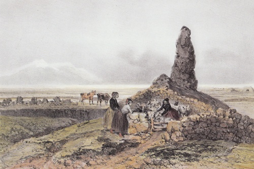 Oven for Skaftåtungen skal i øvrigt hele højlandsstrækningen mellem Skaftå og Tungeå (Túngná; sognebeskr.: Túná) — Tjorsåens store, fra Skaftåjøklen udspringende biflod — være opfyldt af nøgne småfjælde og højdedrag. — Nord for den mod vest strømmende Tungeå skal igen et større fjæld hæve sig, nord for hvilket de næsten ukendte Fiskevande (Fiskivötn, Nj.) brede sig. I disse dreves der fordum ved efterårstid et betydeligt forelfiskeri, men allerede ved midten af forrige århundrede benyttedes dette ikke mere; den lange vej (c. 10 mil), samt slet vejr og mangel på græs til hestene skræmmede folk, og kun enkelte rejser efter »hvanne«-rod foretoges til disse egne; dog også de gik snart af brug. Sv. Povlssön beretter i sin dagbog om forskellige spor af den tidligere udstrakte fisketilvirkning her. — Disse Fiskevande nævnes i Nj. ved de samme to lejligheder, hvor Mælefellssand omtales. Hovedstedet er Nj. s. 153, hvor den såkaldte Fjallabaks-vej (ɔ: vejen bag fjældene) beskrives. Denne vej[14], der i en nyere tid er bleven genoptaget, ligger fra gårdene i Skaftåtunge (sædvanlig Ljótarstaðir) over Mælefellssand til gården Rauðnefstaðir i Rangåvolde syssel og er vel af længde som Grimstungehede, så at man med raske heste og ved anstrængt ridt kan passere den i én dag (ɔ: 15 timer); men denne nord for Øfjældsjøklen liggende, lidet kendte vej er dog kun en kort tid af året passabel. Forfatteren af Nj. synes at forestille sig Fiskevandene langt nærmere ved Mælefellssand end de i virkeligheden er.
