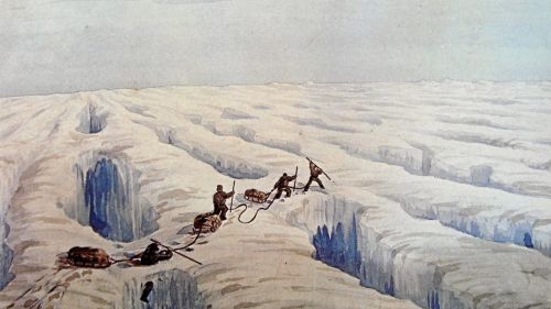 Thi nogle af disse Sprekker kand man gaae udi, som i er Dal, og jeg har i Almindelighed ikke fundet dem dybere end til 4 eller 5 Favne; mange af bemelte Sprekker kand man ogsaa springe over, hvilket vi tidt giorde ved Hielp af vores Gevæhr.