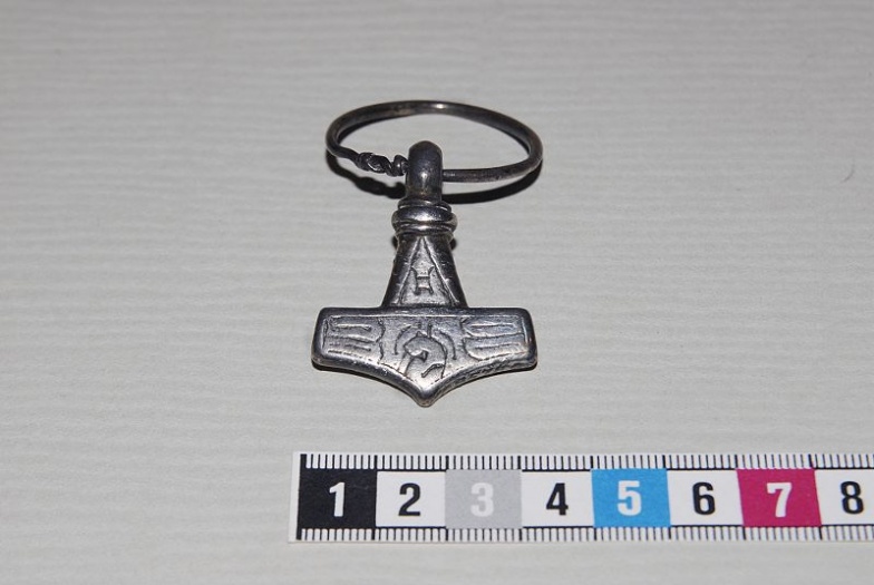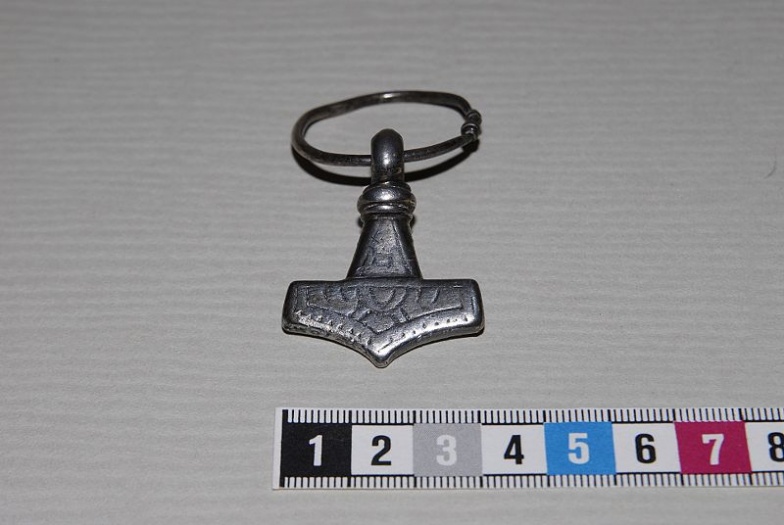 Torshammeren fra Mickels, När, Gotland. Torshammeren var en del av en liten sølvskatt: | Torshammeren fra Mickels, När, Gotland. Torshammeren var en del av en liten sølvskatt: | ||