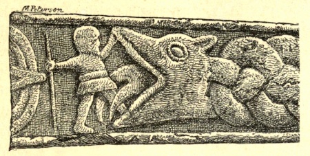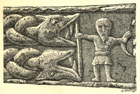 | − | I ''Normandiet'', i klosterkirken S. Georges i Bocherville, der er opført o. 1050 findes et søjlehoved, hvor man ser en mandsskikkelse i kamp med en drage, han er nøgen, stærkt skægget og fører som våben en hammer i sin højre hånd (se Årb. 1884, s. 42). Billedet lader sig hvis | + | I ''Normandiet'', i klosterkirken S. Georges i Bocherville, der er opført o. 1050 findes et søjlehoved, hvor man ser en mandsskikkelse i kamp med en drage, han er nøgen, stærkt skægget og fører som våben en hammer i sin højre hånd (se Årb. 1884, s. 42). Billedet lader sig hvis tegningen er rigtig ikke opfatte anderledes end som Thor, der kæmper med Midgårdsormen. Og da billedet på intet punkt viser hen til myten om Thors fiskefangst, må det være ragnarokskampen, det forestiller. Mindre sikkert er det, om et kors fra ''Man'', hvor en nøgen kortskægget mand med bælte kæmper imod en slange, skal fremstille Thors og Midgardsormens kamp. Ganske vist er det forklarligt nok, at Thor, efter at have udslynget sin hammer imod uhyret, »løfter sin arm op mod slangens hoved, ligesom for at slå den eller trykke den tilbage«; men vi mangler det afgørende kendetegn på den nordiske gud: hammeren<ref>Jf. Bugge i Årb. 1899, 257. Dette mindesmærke kender jeg kun af beskrivelse, ikke af afbildning.</ref>. På en runesten fra Jurby på Man ses en hornblæsende kæmpe med sværd, der vist med rette opfattes som Heimdal; måske har fortolkerne også ret i at tænke sig ham som blæsende til ragnaroks begyndelse<ref>Bugge i Årb. 1899, 250-51; jf. ndfor §15.</ref>. |