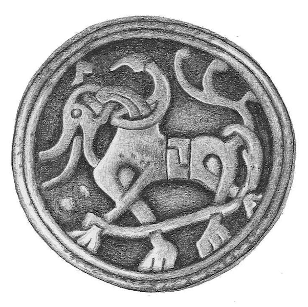 - Billedtekst: Fabeldyr - Smykkeplade med dyremotiv i den såkaldte ringerike-stil. Ca. år 1000. Fundet i Tyskland.