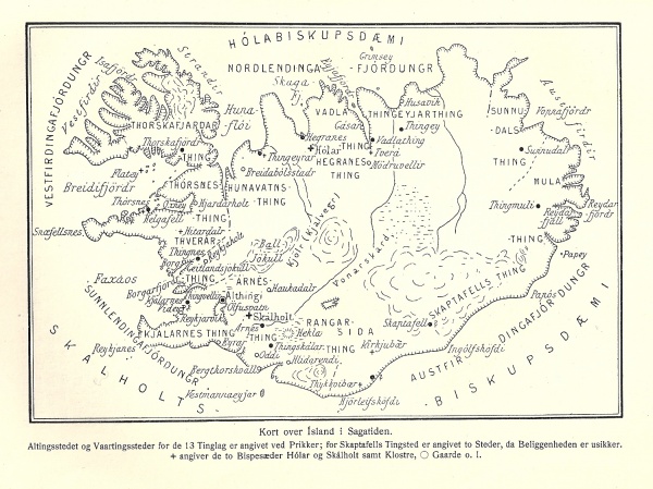 7. Derefter gjør hun ham færdig til Reisen, og rider han sin Vei; meget nedbøiet var den gamle Mand, og kommer han til Thinget. Da vare Boderne blevne behængte med Telte og alle Folk komne til Thinget. Han red hen til en stor Bod; men den Bod eiede Stenthor fra Eyre, en rig Mand og stor Høvding, og tapper og modig. Han staaer af Hesten og gaaer ind i Boden. Der sad Stenthor og hans Mænd hos ham. Haavard traadte hen for ham og hilsede ham vel. Han tog vel imod hans Hilsen og spurgte, hvem han var. Haavard nævnede sit Navn. Stenthor sagde: »Er Du den Mand, som havde den berømte Søn, som Thorbjørn dræbte, og hvis Forsvar blev saa meget berømmet?« Han sagde, at han var den Mand: »Og ønsker jeg, Bonde, at Du vil tillade mig at opholde mig i din Bod saalænge Thinget varer«. Han svarede: »Det tillader jeg visseligen, og vær taus og tilbageholden, thi Svendene drive jævnligen en kraftig Spøg, men Du bærer stor Harm i Hu, og er meget nedtrykt, gammel og duer ikke til nogen Ting«. Det fortælles, at den gamle Haavard valgte sig Plads etsteds i Boden, lægger sig der ned og forlader den Plads aldrig; ei forebragte han sin Sag for noget Menneske, og gik det saaledes indtil langt ud paa Thinget.