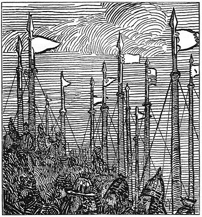 Kong Magnus gjorde sine skibe klar og agtede sig østpå til Norge; han satte sine mænd til landeværn i Dublin. Han lå ved Ulster med hele sin hær og var sejlklar. De mente at have brug for strandhugst, og kong Magnus sendte sine mænd med besked til kong Myrkjartan, at han skulle sende ham strandhugst, og sagde, at det skulle komme dagen før Bartholomæusmesse, hvis budbringerne havde held med færden. Men aftenen før messedagen var de ikke kommet, og på messedagen — ved solopgang — gik kong Magnus med størstedelen af sin hær i land og væk fra skibene for at lede efter sine mænd og strandhugsten. Det var vindstille og solskin. Vejen førte over mose og sump; den var belagt med tilhuggede bjælker og havde kratskov på begge sider. Da de fortsatte, kom de frem til en høj skrænt, hvorfra de havde vidt udsyn; de fik øje på en stor støvsky længere inde i landet og drøftede, om det måske var irernes hær, men nogle sagde, at det sikkert var deres mænd med strandhugsten. Dér blev de stående. Da tog Ejvind Albue ordet: »Konge!« sagde han, »Hvad mener du om dem, der kommer dér? Jeg synes, du er uforsigtig; du véd, at irerne er forræderiske. Kom nu med et godt råd til dine folk.« Da sagde kongen: »Nu samler vi vores hær og holder os klar, hvis dette er forræderi.« Da hærsamlingen var sket, gik kongen og Ejvind frem foran flokken; kong Magnus havde hjelm på hovedet og et rødt skjold med en guldløve på. I bæltet havde han det sværd, de kaldte Knogleknuser; det havde et tværstykke af hvalrostand og et skaft beklædt med guldvæv — det var det bedste våben. Han havde et spyd i hånden og over skjorten en silketrøje, der foran og bagpå var tilskåret med en gul silkeløve. Man sagde, at man havde aldrig set én, der så mere mandig og modig ud. Ejvind bar også en silketrøje magen til kongens, han var også en stor og flot mand med et krigerisk udseende.