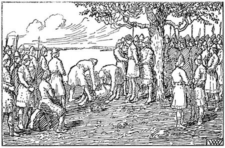 — og da han gik mod galgen, sagde han: »Slette råd er slette.« Derefter blev han hængt, og da galgegrenen slog op, var Tore så tung, at halsen blev flået over, så kroppen faldt til jorden. Tore var større end andre mænd — både høj og kraftig. Egil blev også ført til galgen, og da kongens trælle ville til at hænge ham, sagde han: »I skulle ikke hænge mig; det var mere passende at hænge alle jer!«, sådan som det blev digtet: