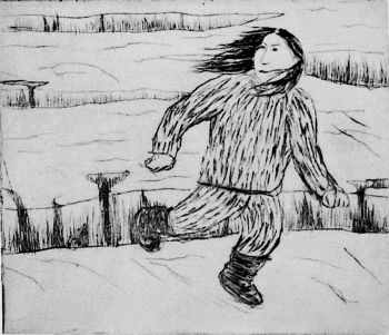 Men engang, da vi havde været oppe ved Elven og mine Brødre drog hjem, blev jeg tilbage, til Trods for at jeg havde fanget Laks nok, og da min yngste Broder som sædvanlig vilde vente paa mig, bandt jeg for et Syns Skyld de Laks sammen, som jeg havde fanget, og fulgtes nedover med min lille Broder. Men mit Sind var nu saaledes, at jeg ikke længere havde Kræfter til at bekæmpe min onde Lyst til at flygte fra Menneskene, og da jeg var gaaet et Stykke ned ad Elven, standsede jeg derfor og sagde til min lille Broder, at jeg vilde gaa tilbage ved Elven og hente min Kniv, som jeg havde glemt. Saa gik jeg tilbage, og hver Gang jeg vendte mig om, kunde jeg se min Broder, der taalmodigt stod og ventede paa mig. Endnu en Gang saa jeg mig om for at se ham for sidste Gang, og da jeg derefter kom bag om et lille Fjæld, gav jeg mig til at løbe indover af alle Kræfter; og jeg løb og blev ved med at løbe og naaede tilsidst saa langt ind og fik et saadant Forspring, at man ikke vilde kunne naa mig, selv om man satte efter mig. Men jeg blev ved med at gaa ind over Land, og aldrig saa jeg noget menneskeligt Væsen inde i dette store Øde.